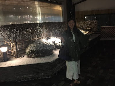 I was really thankful that it was snowing that day because it was the only time we had a true outdoor onsen. Generally, other hotels' outdoor onsens are open but sheltered. You get to feel the cold breeze but nothing falls on you. This one is totally in the open and snow was falling on us while we were soaking in the hot onsen! This is the real experience of half the body feeling the cool air while half the body submerging in warmth. I was with 3 other groups of women in my tour group and we were having so much fun building snow man and putting on snow mask. At the last part, one of them threw a pile of snow up the air above me. The feeling when the snow falls onto the bare skin makes me feel so contented and so blessed!